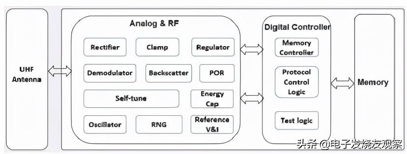 在结构上,羽阵600主要由模拟&射频部分、数字控制器和存储器三个部分组成。模拟&射频部分提供稳定的电源并解调从阅读器接收的数据,然后由数字控制器进行处理。此外,模拟&射频部分的反向散射将调制数据回发给阅读器。数字控制器包括协议控制、存储控制器以及测试逻辑,负责处理EPC协议并完成读写器的通信。具体的芯片内部结构如下图所示。