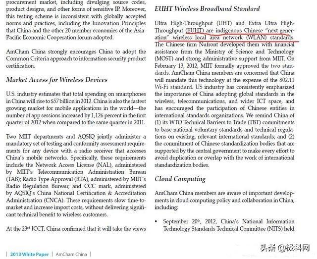 新岸线的判断是准确的。对于一个年轻的追赶者而言,前路必然会有人设置羁绊。EUHT是一项自主技术,所以不可避免地从一开始就受到了美国和欧洲国家的强烈关注,美国国会曾经连续三年发备忘录称EUHT可能是一个威胁。 2010年EUHT立项,就受到美国贸易代表办公室注意。2012年EUHT获得两项工业和信息化部颁发的两项行业标准后,美国贸易代表办公室即将EUHT写进了2013年递交给美国国会的报告。2014、2015年,美贸易代表办公室持续将EUHT写进对美国会的报告中。