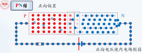 当外加一个电压形成的电场与内建电场相反时,便可以抵消内电场,同时可以在负极注入更多的电子,这个时候便形成了通路。当加入一个反向电压时,外电场方向与内电场方向相同,电场加强,电子便无法通过,这就是P-N结单向导电的本质原因。