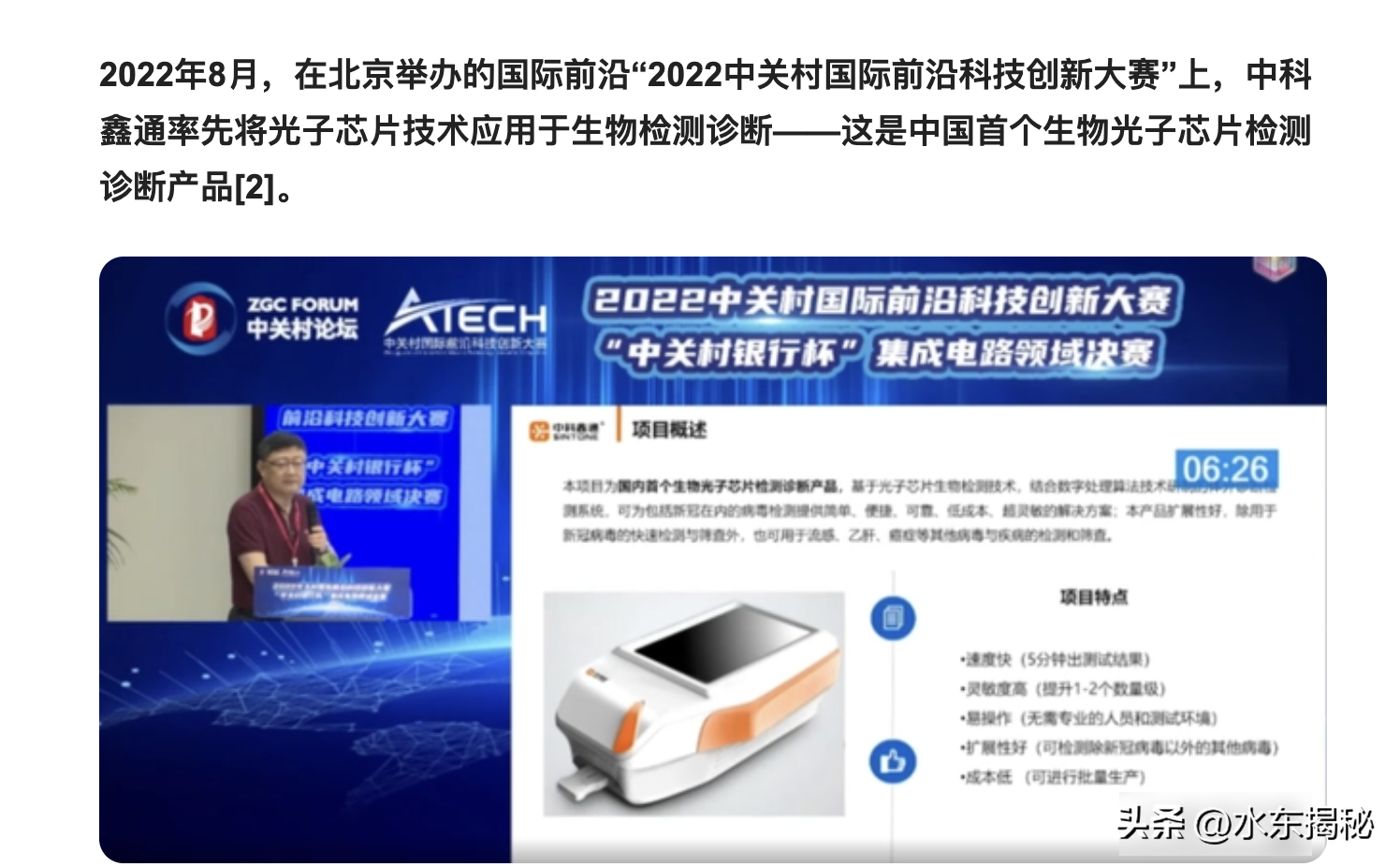 而光子芯片明年在北京新建产线的事,北京日报也官宣了,所以,这事,也就是板上钉钉的事了,今年8月份,中科鑫通率先将光子芯片技术应用于生物检测诊断,以新冠检测为例,你看,光子芯片,实现了5分钟之内、就快速出结果了,远快于核酸检测的时间。