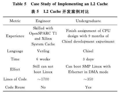 其实,我们自己还做过量化的评估。在2018年,我们团队里有两个本科生和一个工程师做过一个实验。这个实验是要开发一个L2 Cache,但是要集成到RISC-V的内核里。我们的工程师是用Verilog来开发的,他对Cache非常熟悉。他把OpenSPARC里面的Cache、还有Xilinx提供的Cache等等都研究过,代码都读得很透。所以他用Verilog开发,并且接到RISC-V里面去。当时他花了应该是6个星期开发,包括测试框架等等,一共写了5000多行代码。即便这样,后面还是有一些问题和Bug。