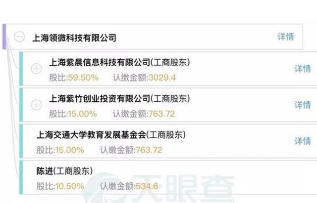 十几年前的“上海交大汉芯科技有限公司”在“汉芯造假”事件爆发之后并非停止运营,后来公司名称变更为“上海领微科技有限公司”。陈进是该公司的自然股东和董事,拥有10.50%的股权,认缴出资了534.6万元,也是最大的个人股东。