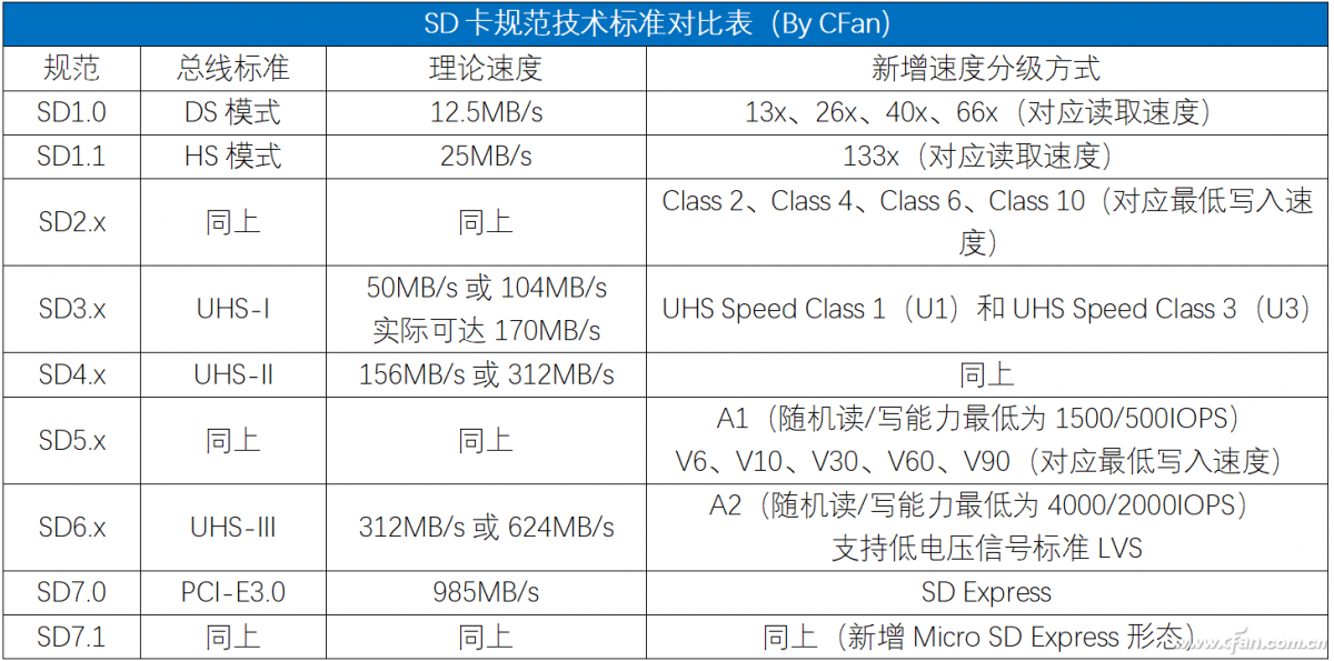 SD7.x是最新的SD卡规范标准,它们引入了PCIe总线和NVMe协议,读取速度理论可达985MB/s,目前威刚已经推出了符合该标准的Premier Extreme SDXC SD Express存储卡,但SD7.x存储卡的价格更是吓人,兼容这种存储卡的设备也是凤毛麟角。