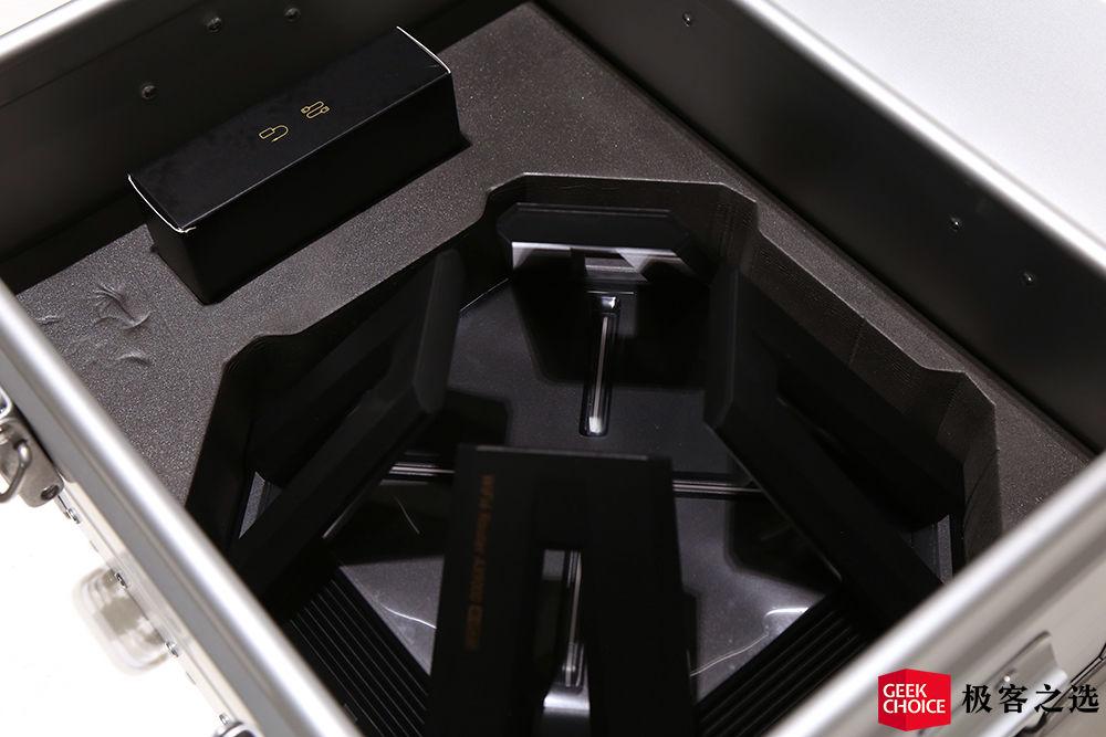 极客之选在收到产品时也吃了一惊,整个包装非常大我们甚至怀疑里面装的不是路由器产品,打开纸箱之后发现里面是一个很有质感的铝制箱子。打开之后,小米路由器 AX9000 就安静的躺在那里,当然这个是媒体版本的包装,并非上市销售的版本,但按照产品的尺寸来看,零售版的包装同样不会很小。