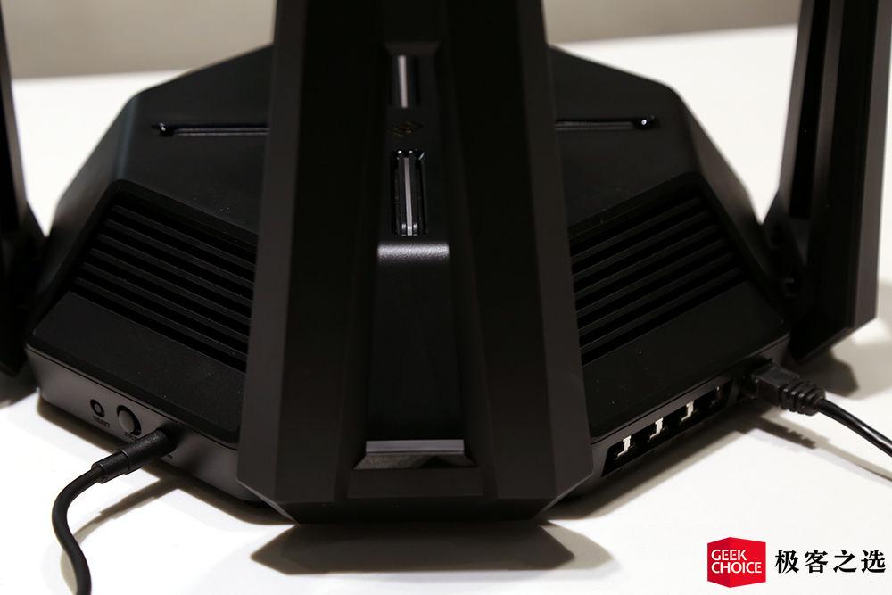 因为小米路由器 AX9000 采用了八边形的设计并且拥有四组天线,所以很自然的另外四个「边」就成为了其他功能安置地。小米路由器 AX9000 的正面拥有两个状态指示灯,左侧是 USB 3.0 接口和 Mesh 按钮,右侧是开关、电源接口和重置按钮,后方则是 1 个 WAN 口和 4 个 LAN 口的布局,其中 WAN 口支持千兆以上宽带接入,LAN 口理论速率最高可达 2.5Gbps,支持组建 NAS 进行局域网传输。比较不爽的是,网线和电源没在一个部分,所以视觉效果会有些凌乱。