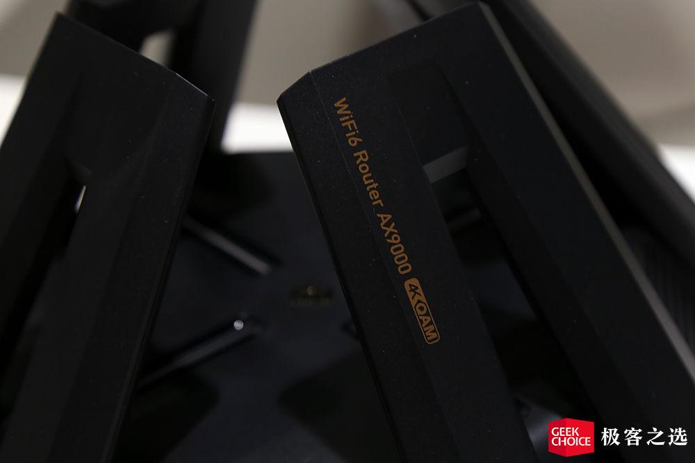 这四组天线的底部采用了转轴设计,依旧是为了美观的考量,转轴带有限位设计,除了折叠状态以外,还有两个位置有固定感。在其中一组天线上,还印有「WiFi6 Router AX9000」的字样以及 4K QAM 技术的 logo 标识,这个处理手法在小米路由器 AX6000 也见到过。