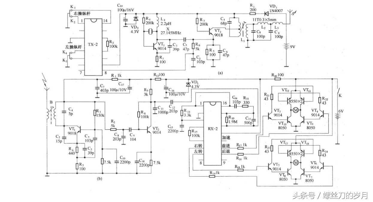 昨天我们介绍了YX-8116AM 单通道 直流 马达驱动器IC,今天我们继续介绍另外一对好基友,TX-2B/RX-2B 5功能的遥控玩具车发送与接受电路