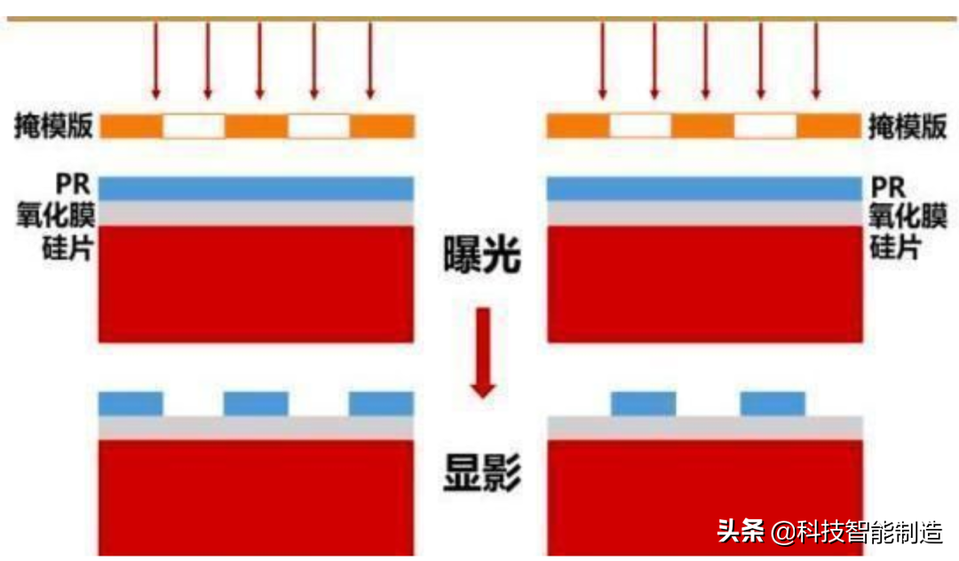 而光刻根据所采用正胶与负胶之分,划分为正性光刻和负性光刻两种基本工艺。在正性光刻中,正胶的曝光部分结构被破坏,被溶剂洗掉,使得光刻胶上的图形与掩模版上图形相同。相反地,在负性光刻中,负胶的曝光部分会因硬化变得不可溶解,掩模部分则会被溶剂洗掉,使得光刻胶上的图形与掩模版上图形相反。