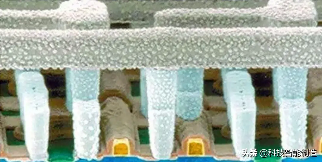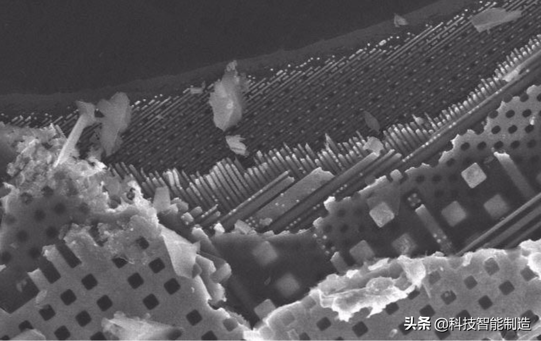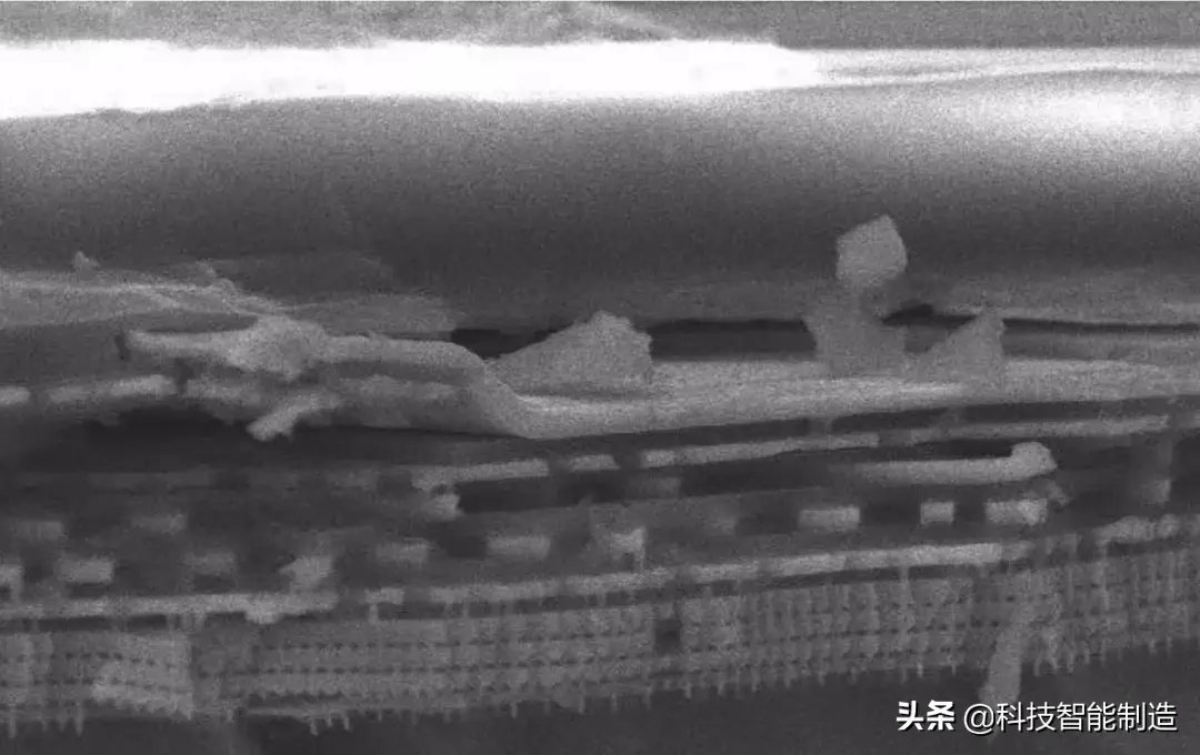 这是一个Top-down View 的SEM照片,可以非常清晰的看见CPU内部的层状结构,越往下线宽越窄,越靠近器件层。