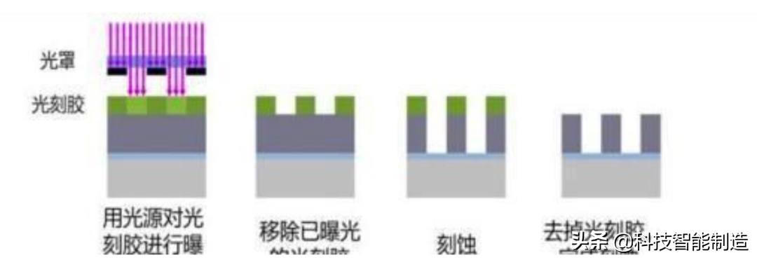 而其中,还涉及到的材料就是光刻胶,我们要知道电路设计图首先通过激光写在光掩模板上,然后光源通过掩模板照射到附有光刻胶的硅片表面,引起曝光区域的光刻胶发生化学效应,再通过显影技术溶解去除曝光区域或未曝光区域,使掩模板上的电路图转移到光刻胶上,最后利用刻蚀技术将图形转移到硅片上。