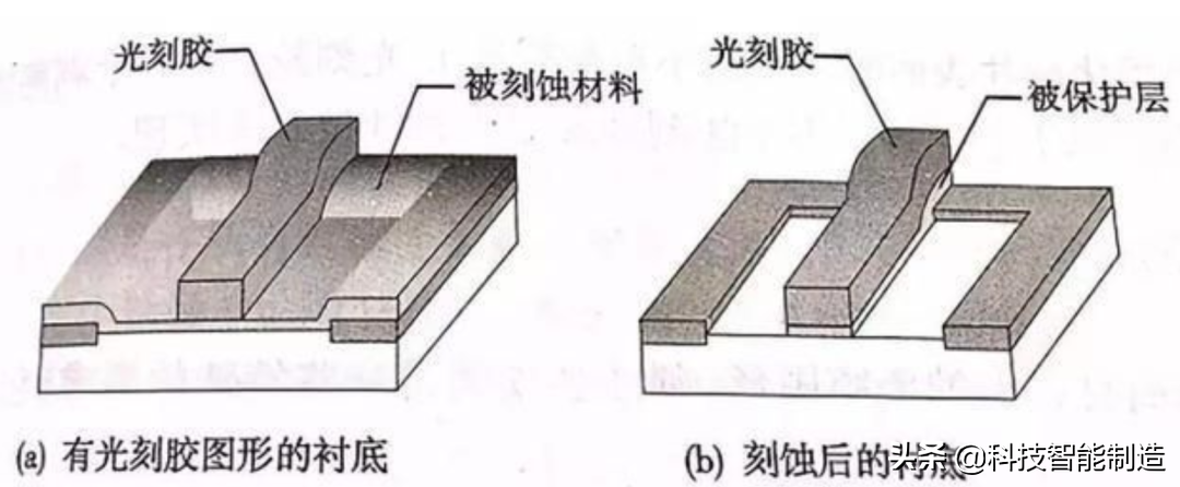 “刻蚀”是光刻后,用腐蚀液将变质的那部分光刻胶腐蚀掉(正胶),晶圆表面就显出半导体器件及其连接的图形。然后用另一种腐蚀液对晶圆腐蚀,形成半导体器件及其电路。